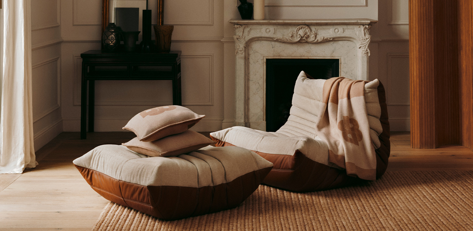 Thoughtfully curated BOSS accessories complement the craftsmanship of the BOSS | LIGNE ROSET Togo. Duotone jacquard cushion covers and a throw finished with saddle-stitching echo the chair’s refined material play. Additionally, pieces from the Spring/Summer 26 collection like the Madison bag and Gary trainers were specially selected to reflect the Togo’s leather-fabric material mix and to showcase BOSS tailoring expertise. Gary trainers in light beige cotton–linen canvas with leather trims mirror the Togo’s tonal sophistication. A textured canvas holdall with leather accents, a detachable shoulder strap and key holder, and an embossed logo completes the ensemble, bringing a sense of elevation to on-the-move, lifestyle tailoring, and interior design.