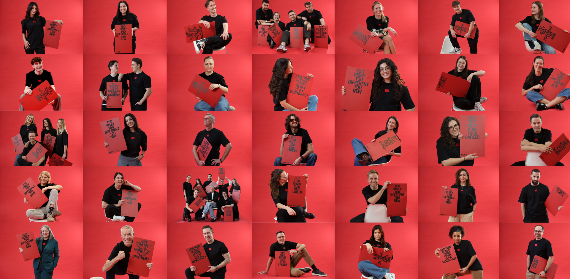 We complemented the global launch of HUGO Spring/Summer 2026 by inviting our colleagues to step into the campaign. At our headquarters, participants could select their favorite phrase from the six campaign statements — ranging from “Why couldn’t you be more like your brother?” to “But that might ruin your career” — before striking a pose for a professional photo against a bold red backdrop.